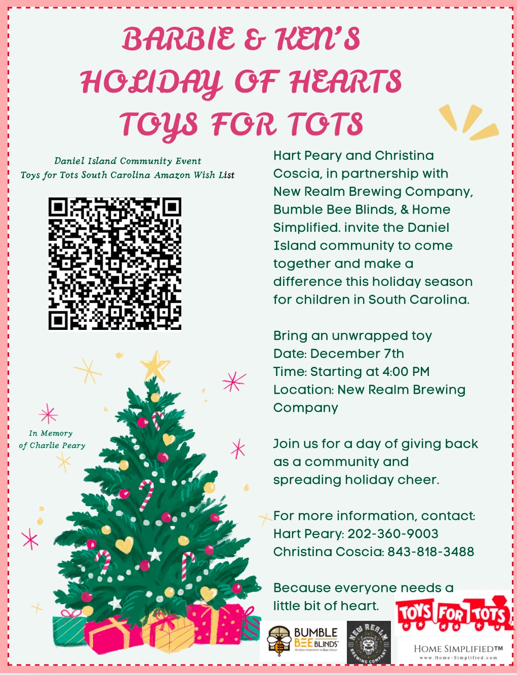 Hart Peary and Christina Coscia, in partnership with New Realm Brewing Company, Bumble Bee Blinds, & Home Simplified. invite the Daniel Island community to come together and make a difference this holiday season for children in South Carolina. Bring an unwrapped toy Join them for a day of giving back as a community and spreading […]